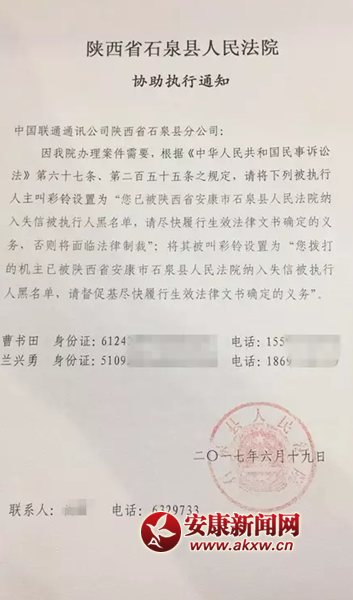 安康新聞網(wǎng)訊(通訊員 尚君)“您撥打的機(jī)主已被陜西省安康市石泉縣人民法院納入失信被執(zhí)行人黑名單,請(qǐng)督促其盡快履行生效法律文書(shū)確定的義務(wù)”,這樣的彩鈴您從來(lái)沒(méi)聽(tīng)過(guò)吧!今后,這樣的彩鈴您在生活中或許就會(huì)遇到。6月19日,石泉縣人民法院由安康市中級(jí)人民法院指定為“通信限制”試點(diǎn)法院,分別與石泉縣移動(dòng)、電信、聯(lián)通三大通信公司協(xié)商一致,將通過(guò)發(fā)送《協(xié)助執(zhí)行通知書(shū)》的方式請(qǐng)三大通信公司協(xié)助執(zhí)行,在全省率先對(duì)“老賴(lài)”實(shí)施通信限制。rgM安康新聞網(wǎng)