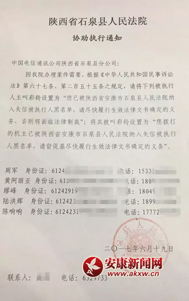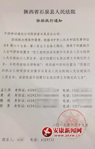 6月19日下午,石泉法院將首批需要進(jìn)行通信限制的11名“老賴(lài)”名單提供給了三大通信公司,要求其協(xié)助執(zhí)行。rgM安康新聞網(wǎng)