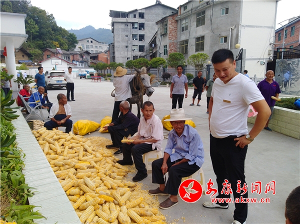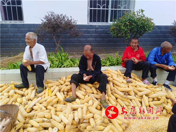 一大早,敬老院的費(fèi)院長(zhǎng)就安排院內(nèi)2位職工到玉米地組織工人采收玉米。為了安全起見(jiàn),院內(nèi)有勞動(dòng)能力的老人沒(méi)有安排外出采收,而是負(fù)責(zé)在敬老院內(nèi)組織人員剝玉米、晾曬。工人吆喝著騾子隊(duì)拖著一筐筐玉米回到敬老院,李建國(guó)等幾個(gè)有勞動(dòng)能力的五保老人就過(guò)來(lái)搭手,將一筐筐玉米攤放在院場(chǎng)內(nèi)晾曬。工作人員和其他的五保老人一起,紛紛參與到剝玉米的行列,院場(chǎng)中堆滿了金燦燦的玉米,老人們個(gè)個(gè)拿著玉米棒子正在脫粒。今年的玉米大豐收,個(gè)個(gè)玉米棒子顆粒飽滿,顏色金黃誘人。大家忙活著,露出豐收的喜悅。