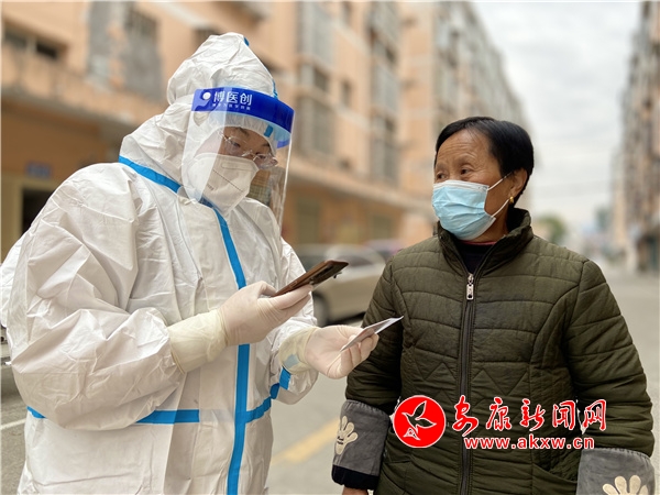 一人接著一人,一戶接著一戶,入戶采樣人員分散多地,醫(yī)護(hù)人員不停走村入戶,奔波于不同的小區(qū),不同的樓層,拼著勁,拎著大包小包的防護(hù)與采樣物資,互相鼓勵(lì)著爬樓梯。每一次敲響居民家門(mén),每到一戶家中,他們都會(huì)對(duì)居民進(jìn)行詳細(xì)的信息登記、采樣、消毒,每個(gè)環(huán)節(jié)采集人員都一絲不茍地規(guī)范操作,叮囑每一位居民要做好防護(hù)。