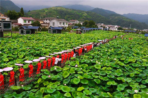 在石泉縣池河鎮(zhèn)五愛(ài)村,群眾正在進(jìn)行荷田旗袍秀。龔仕建攝