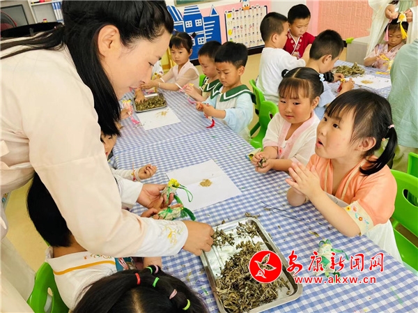 活動前,老師們精心準備了主題教育,通過視頻、兒歌教學、師幼互動等形式一起追溯端午節(jié)的由來,講述屈原的愛國故事,了解端午節(jié)吃粽子、賽龍舟、掛艾草、做香包等習俗;顒诱介_始,只見老師和孩子們身著漢服,仿佛回歸漢唐。孩子踩著一條由艾草鋪成的道路,老師依次為小朋友系“五彩繩”、雄黃“畫額”、“沐蘭湯”凈手,寓意驅邪避蟲,祝福孩子平安健康。儀式結束后,孩子們在院內品嘗了各式香粽、大蒜、雞蛋和水果。隨后又在班級制作了端午吉祥物——香包,并相互佩戴。最后,大家齊聚院內,開展了“賽龍舟”、投壺、射五毒等端午傳統游戲活動。