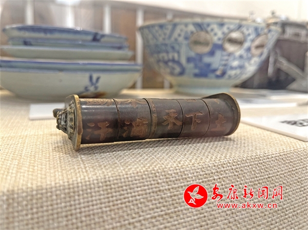 轉(zhuǎn)入內(nèi)間,是鎮(zhèn)史溯源板塊,大事紀(jì)要展板條理清晰,各類農(nóng)耕用具散布各處。其中一個(gè)玻璃展柜格外顯眼,展柜中一摞青花瓷碟碗痕跡斑駁,一把藏詩(shī)鎖靜靜躺在一旁。只見橫式的圓柱體銅鎖有5個(gè)撥輪,上面共有20個(gè)行書漢字,連讀起來正是唐詩(shī)《憫農(nóng)》,銅鎖表層有重度磨痕,但字跡依舊清晰,鎖的兩側(cè)均鑄成獅子頭狀。“想打開這把鎖先得有文化、會(huì)識(shí)字,還得知道語句特有的順序。”據(jù)這件銅鎖的捐贈(zèng)者梁延介紹,這把密碼鎖是原屬于金寨一家大戶,是祖?zhèn)鞯奈锛䞍骸?span style="display:none">T5i安康新聞網(wǎng)