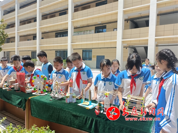 舞臺(tái)中央“童心向未來,筑夢(mèng)新時(shí)代”一行醒目的紅色標(biāo)題映入眼簾。少先隊(duì)員納新儀式上,黨員教師和輔導(dǎo)員老師共同為新入隊(duì)的孩子們佩戴上鮮艷的紅領(lǐng)巾,新隊(duì)員們?cè)诖箨?duì)輔導(dǎo)員的帶領(lǐng)下莊嚴(yán)地宣誓。各班、各社團(tuán)精心編排的文藝節(jié)目依次上演,精彩的節(jié)目引起陣陣歡呼,掌聲響成一片。隨后,還組織了學(xué)生書畫和科技小制作展覽,大家不時(shí)駐足觀看,燦爛的笑容匯成校園里一道亮麗的風(fēng)景。