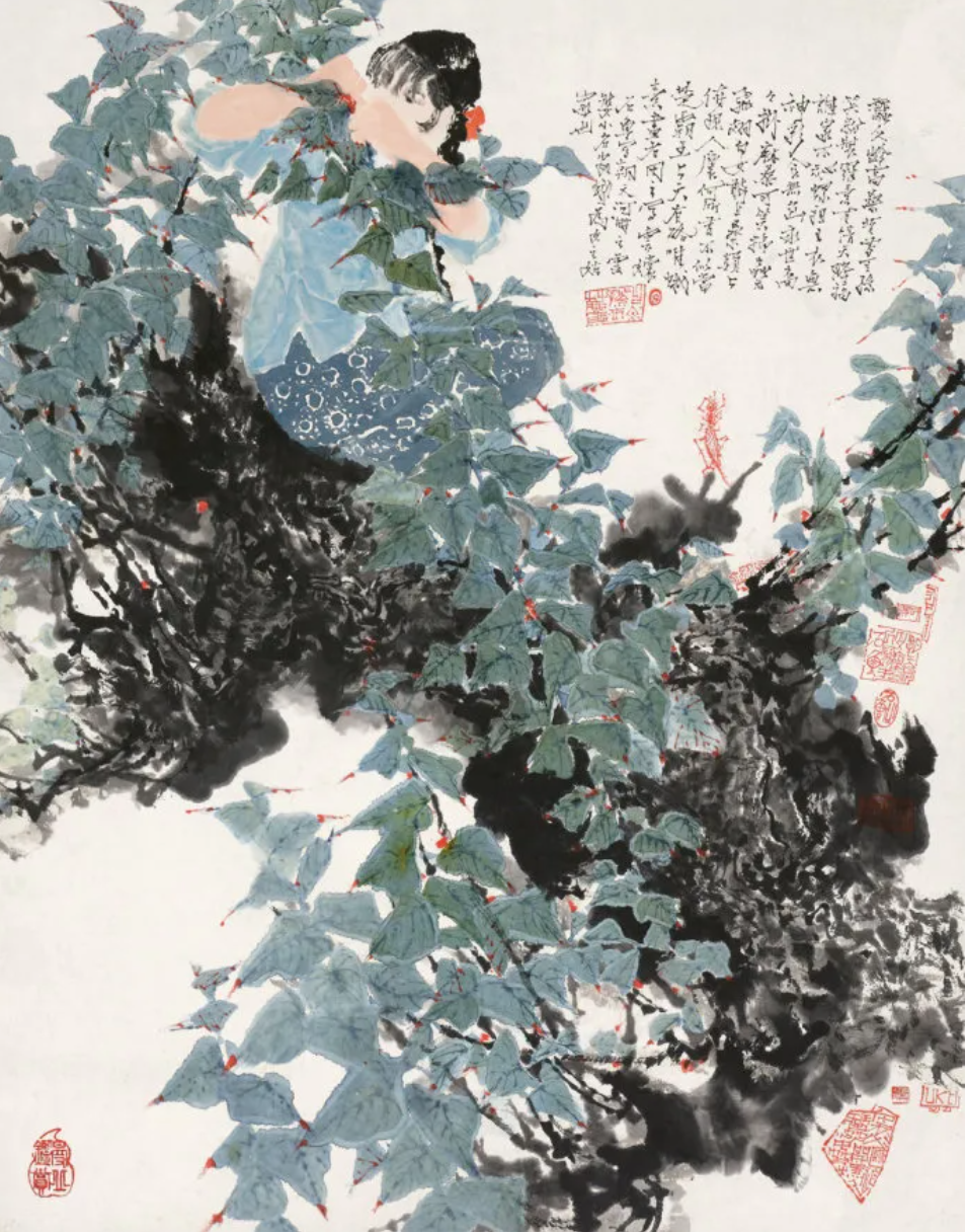 題識(shí):蠶女齡喬桑,昔有王孫笑粉妝。羅素有情天降福,誰家不秘王祖。衣無神采食無魚,永世商裔掛麻桑?尚γ尴x無飛翅,白女敢上桑顛上。俯視人寰何所有,不似當(dāng)(年)楚霸王。上天有路唯蛾素,畫者因之寫云。石魯寫朝天河畔之云婆,小名安蛾,為女之姑家也!恫缮D》,2010春拍成交價(jià)1064萬元。